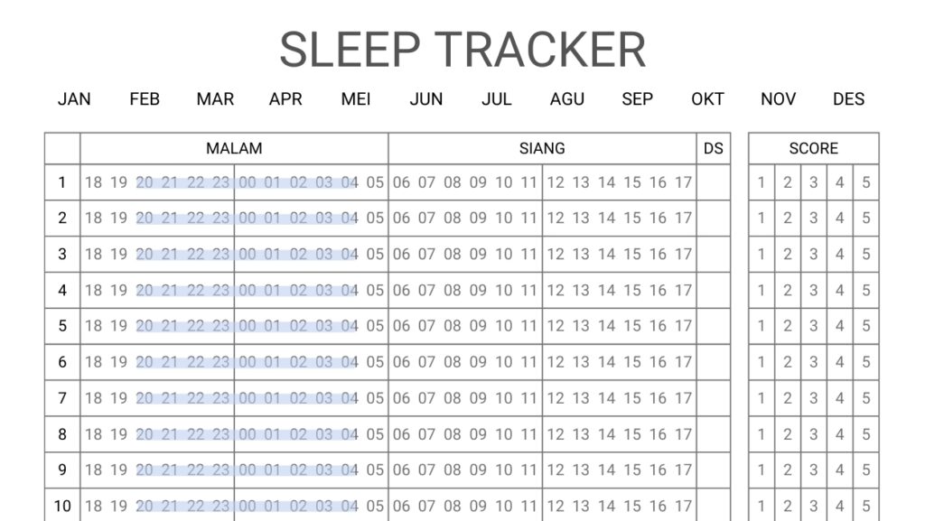 Printable sleep tracker bermanfaat untuk membantu memantau pola tidur harian, mengenali kebiasaan tidur yang kurang ideal, mengidentifikasi faktor-faktor yang memengaruhi kualitas tidur, dan membangun rutinitas tidur yang lebih konsisten agar tidur lebih berkualitas.